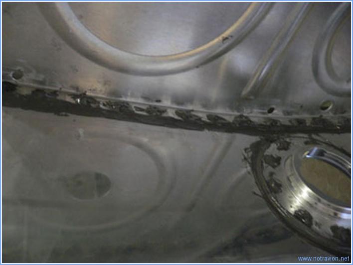 La session a été consacrée au rivetage des deux nervures posées hier. Cela se passe de la façon suivante: dépose de la pince, nettoyage du perçage à l'outil à ébavurer et à l'acétone, pose d'un peu de mastic dans l'embrèvement à l'aide d'un cure-dent, mise en place du rivet et rivetage au pistolet. Comme la nervure est déjà collée avec le mastic, elle ne bouge plus et comme le seul mastic non solidifié est celui mis dans l'embrèvement, le travail se fait assez proprement. J'ai noté que les rivets dépassent un peu plus de la peau que ceux des raidisseurs, j'en ai changé quelques uns mais il faudra que je creuse un peu plus les embrèvements dans le futur. J'ai ensuite mis en place trois autres nervures pour les riveter demain. Naturellement il faut tout nettoyer pour finir.