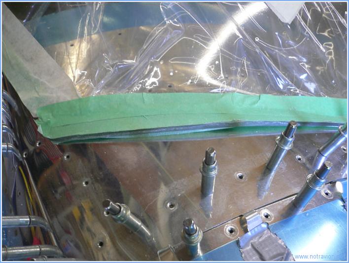 Après une énième installation sur le fuselage, la ligne de coupe est marquée avec deux bandes d'adhésif. J'en rajoute plusieurs couches pour créer un petit sillon qui permettra de guider le disque de coupe.