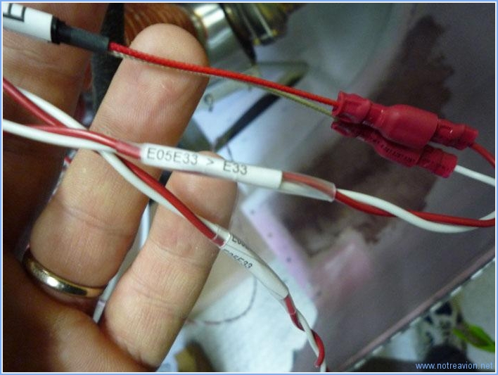 Suite du câblage du compartiment moteur. Je commence par marquer les câbles des capteurs EGT (température des gaz d'échappements) et CHT (température des tête de cylindre). Il y a au total 16 câbles à marquer et dont il faut sertir les cosses du coté moteur. Comme les câbles vont seront peut être recoupé du coté cabine, je ne fais qu'un marquage provisoire. Voici les deux marquages, les cosses, on peut deviner le marquage du câble coté moteur à gauche (E blanc).